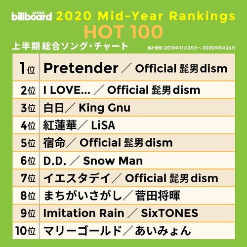 Official髭男dism 2020年上半期 総合ソング・チャートJAPAN のランキングで凄い事になるw 髭だらけww 2020年上半期 総合ソング・チャートJAPAN のランキングが凄い事になってました(*'ω'*) ランキング 1位 Official髭男dism2位 Official髭男dism3位 King …