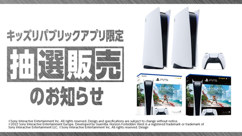 今回の抽選販売は、PS5通常版とPS5デジタル・エディションに加え、「Horizon Forbidden West」同梱版が対象。応募にはキッズリパブリックアプリのインストール・会員登録が必要となっている。